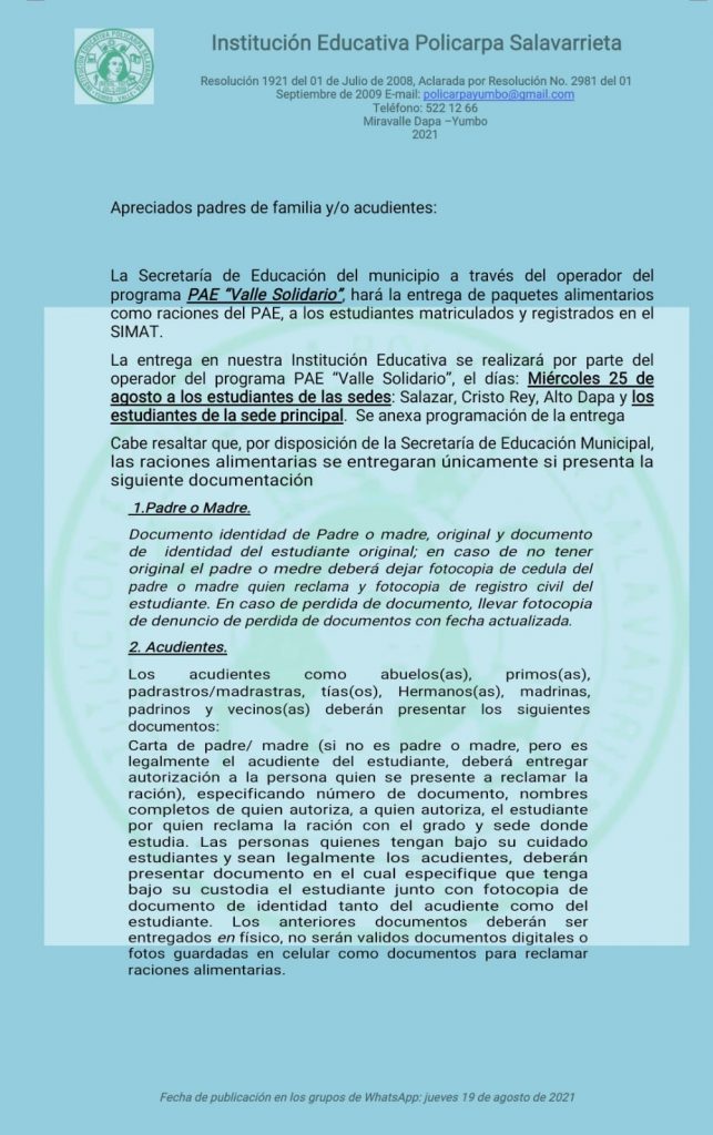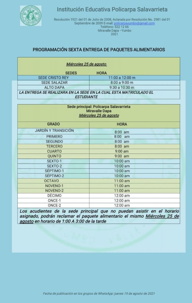 Sexta entrega paquetes alimentarios – Miércoles 25 de agosto. 19 agosto, 202119 agosto, 2021 Administrador Policarpa